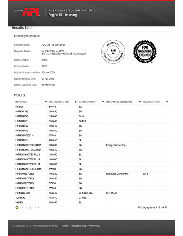 With consistent efforts in pursuing quality and standards, HIPRO products are certified and awarded the American Petroleum Institute (API) license since June 2005. The certification is an international recognition that we can consistently meet consumers' requirement and internationally valued standards.